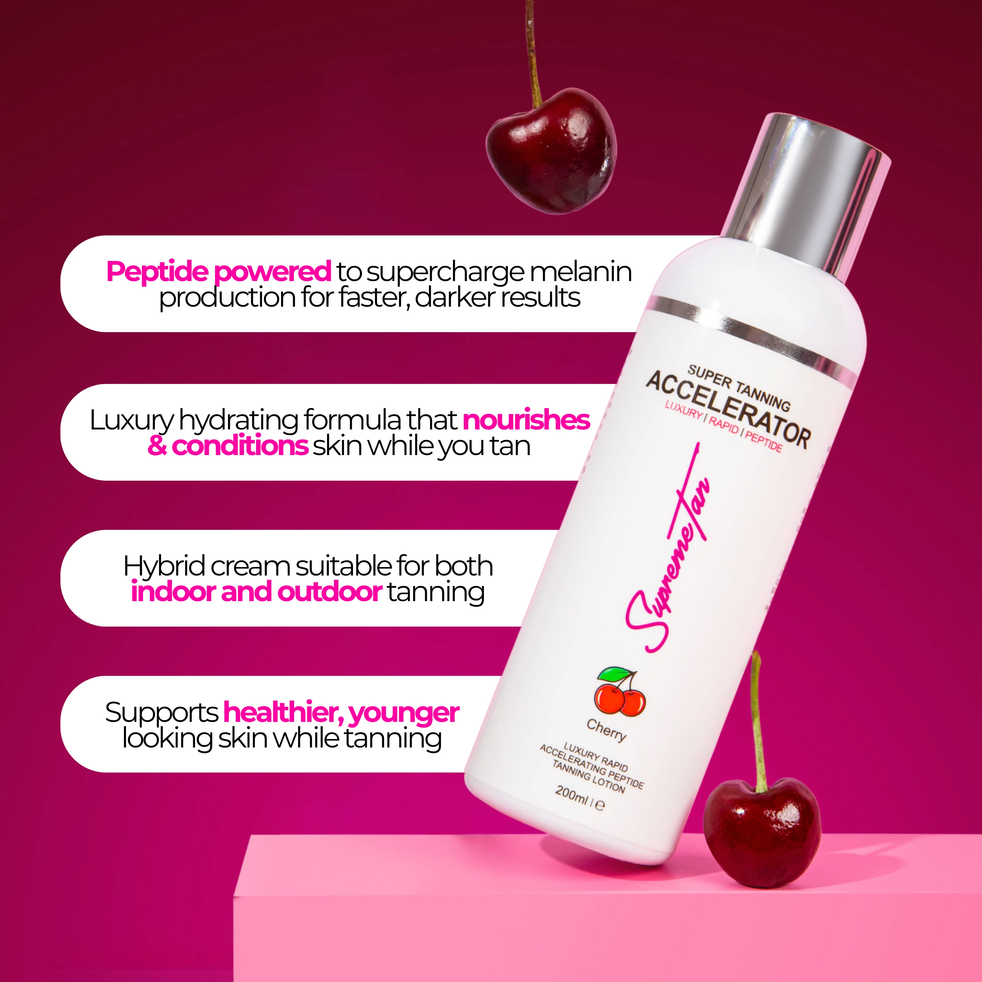 Our New Luxury Super Accelerator Peptide Tanning Cream has luxury and hydrating ingredients that allows the skin to tan darker and deeper than any other tanning creams available! Suitable for those who wish to achieve the darkest tan possible!
