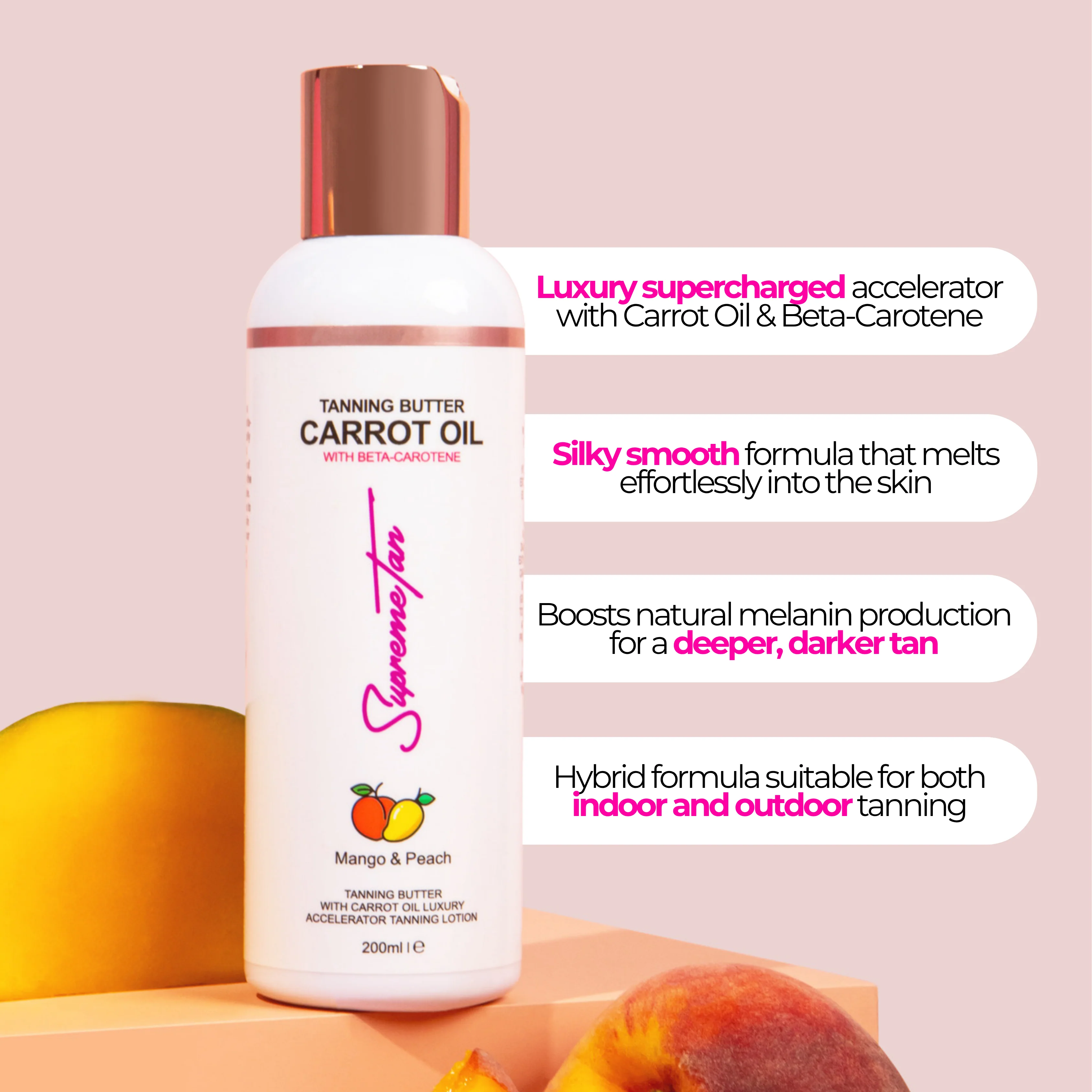 This is our luxury tanning cream, a super charged carrot oil and beta-carotene accelerator specifically formulated to stimulate and amplify the natural production of melanin in your skin to achieve the fastest and darkest tan possible.