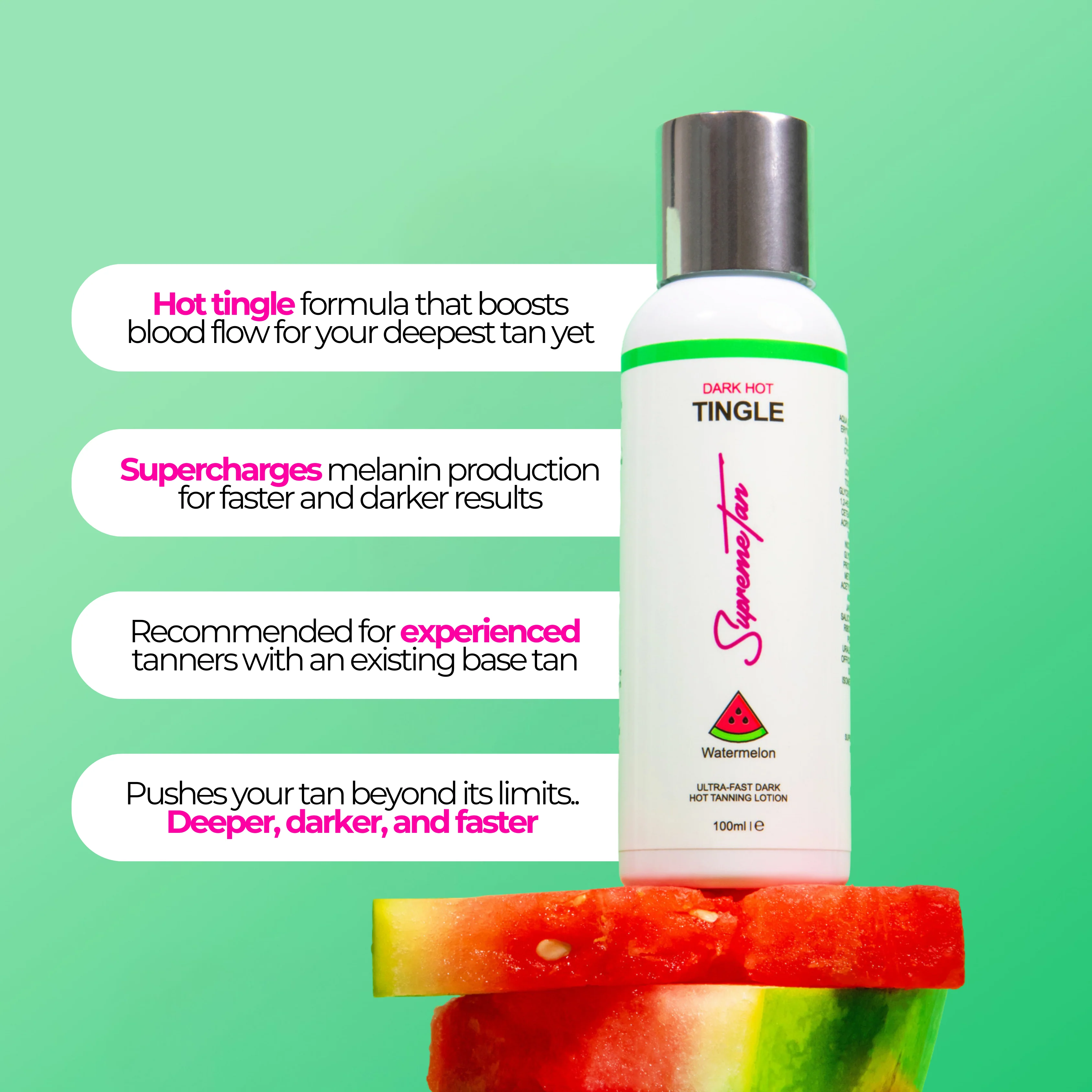 Finished with a refreshing watermelon fragrance for a pleasant tanning experience.